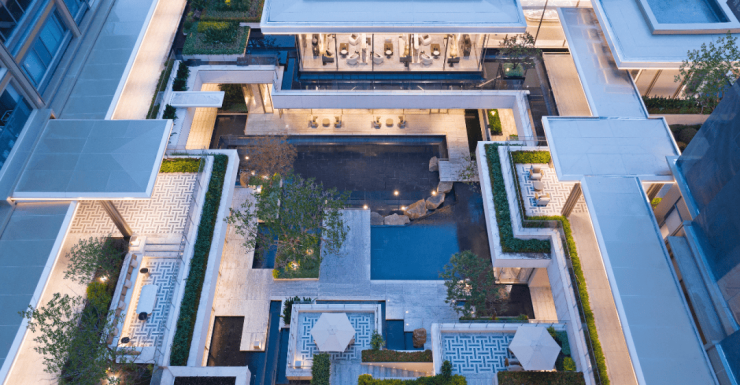 进入它的下沉式庭院,扑面而来的又是另一种中国山水画一般层峦叠嶂的松弛惬意。整个下沉式庭院的竖向高差有约6米,中间是一大片立体镜面水景,高差之间用太行金整石铺出了一条路,让原本精致的水景,瞬间拥有了仿佛山川溪涧般的野趣。