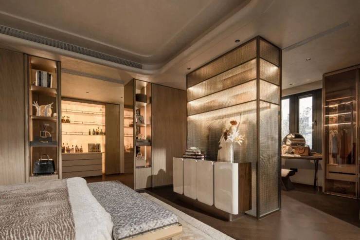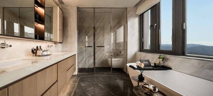 精装叠墅以现代艺术风格,采用轻奢石材地面、锡绣元素背景墙,精雕优雅生活格调;臻选SMEG冰箱、劳芬、杜拉维特、弗兰卡、大金空调、兰舍新风系统、滨特尔全屋净水等全球一线精装品牌,定制奢适所享。