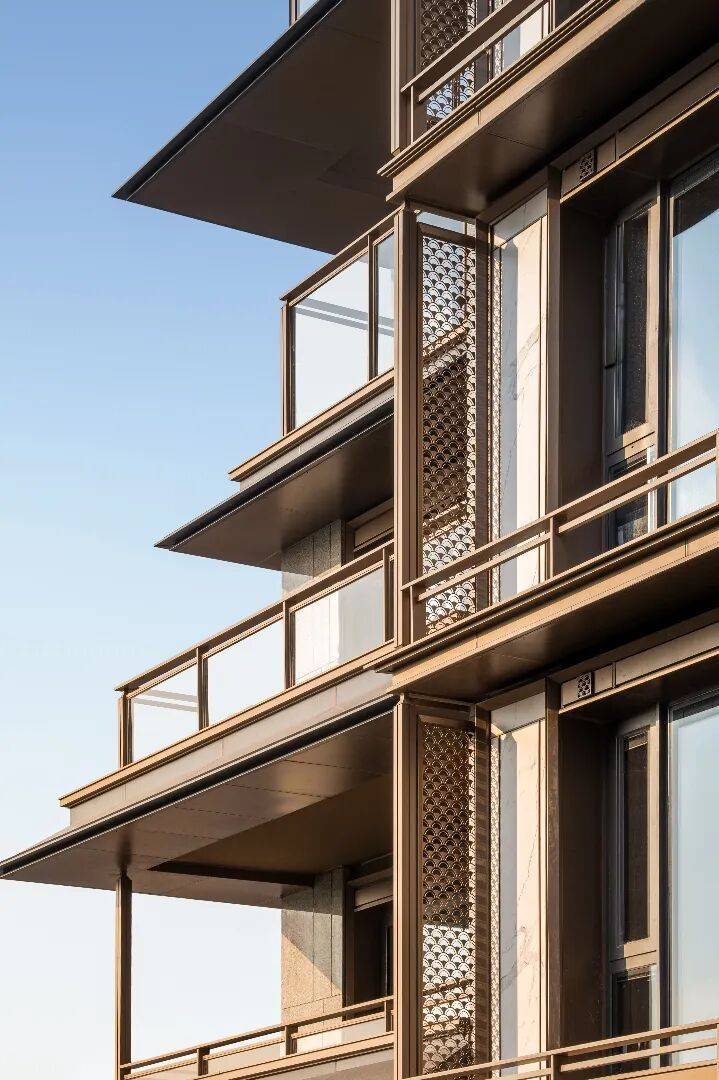 本项目的低多层住宅,化用龙光塔的层层重檐为现代的金属挑檐,既有东方韵味,又具有时代特征。立面以“石中藏玉”美好寓意,通过金属、大理石、香槟色金属线条、石材幕墙,呈现别具一格的风雅意韵。