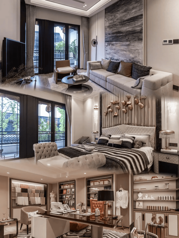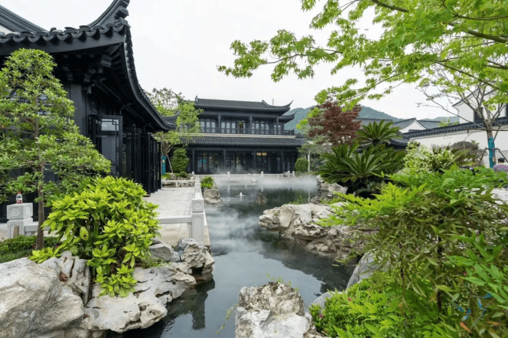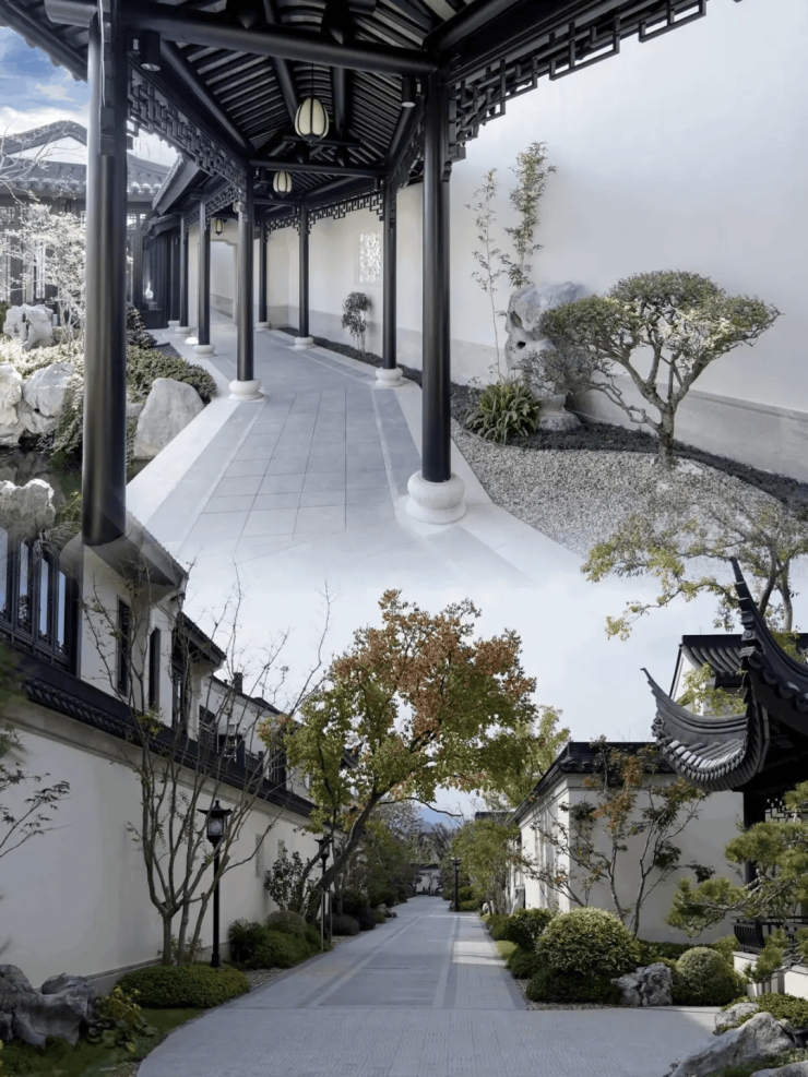 建筑风格:项目建筑由GOA大象设计公司执笔,外立面以浅米色石材搭配深灰色金属线条,屋顶采用硬山青瓦与歇山顶设计,飞檐戗角还原宋式建筑风骨。特邀世界非物质文化遗产香山帮第24代传承人谢理想团队,亲制叠石理水、雕花窗棂等细节。