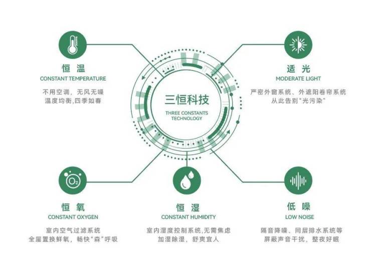 项目采用朗诗三恒科技,营造“恒温、恒湿、恒氧、低噪、适光”的健康舒适生活场景,不用空调,也能享受四季如春的居住体验,是城市新贵的至优选择。