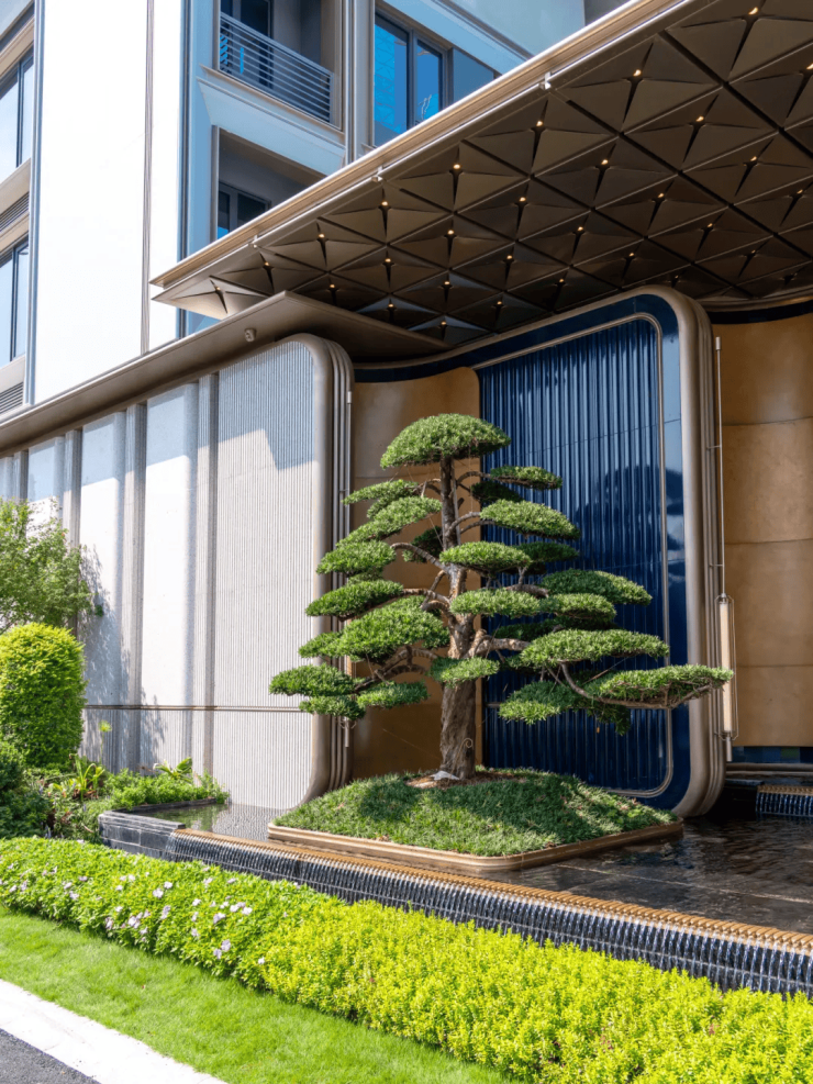 外立面采用四面铝板+大面玻璃+局部石材,延续滨江豪宅基因;