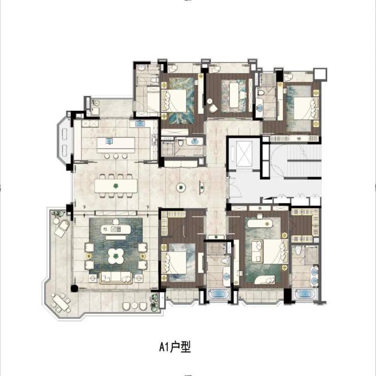 建面约212㎡户型以十字中轴构建出雍容开阔的空间,约5.1米阔绰宽厅配合南北双阳台,使空间更加通透明亮,4房设计,足够三代同堂。