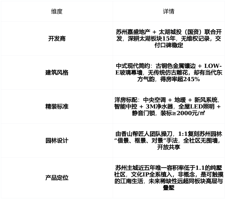 核心优势:苏州主城罕见容积率1.01纯墅社区+香山帮匠人亲手打造新江南美学+“三境归家”五园造境体系+星空顶车库、回纹景墙、祥瑞木凳等文化IP全系植入+步行10分钟达三甲吴中区人民医院+3公里内太湖中心MAL…