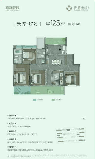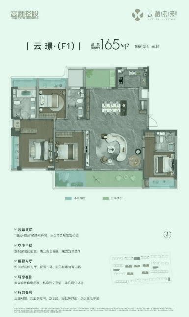 高实得率 改善精装四房主城难得约125-165㎡全四房改善洋房,以洋房高得房率为基底,叠享空中花园+飘窗(全赠送)、南北双阳台(半赠送)等多维不计容空间,以最高超100%有效空间增值,重新定义改善型居住标准。