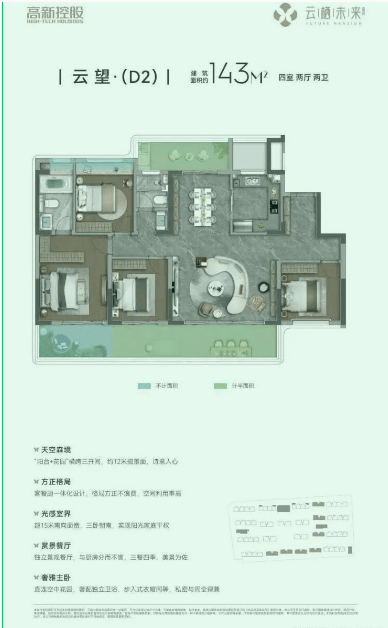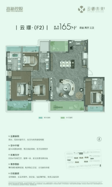 :首创"奇偶错层"设计,每户配建不计容空中花园,实现立体绿化覆盖。
