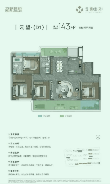 空间设计突破:采用LDKBG五维交互布局(客厅+餐厅+厨房+阳台+花园),143㎡户型得房率超95%,南向面宽达15.2米。