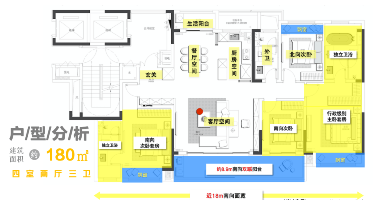 180㎡四居:4室2厅3卫,五开间朝南,南向开间近18米,双套房设计+独立书房