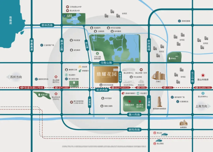 鼎耀花园坐落于昆山市城西体育场路168号,紧邻地铁11号线文化艺术中心站,步行仅需约500米,轻松连接苏州与上海,实现双城生活的无缝切换。同时,项目周边中环快速路、前进路等主干道环绕,自驾出行同样便捷,无论是前往昆山市区还是上海虹桥枢纽,都能迅速抵达。