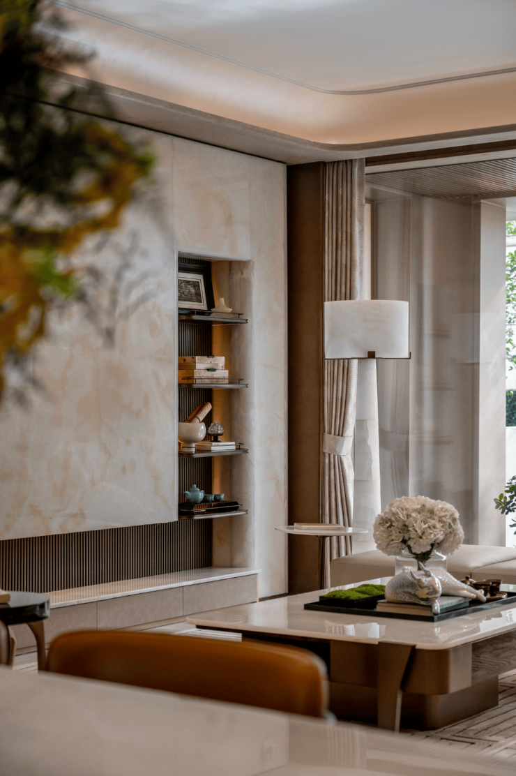 南向外立面采用大面积落地窗 + 湾流曲线设计,搭配雅淡浅色系石材,营造轻盈通透的现代感 。