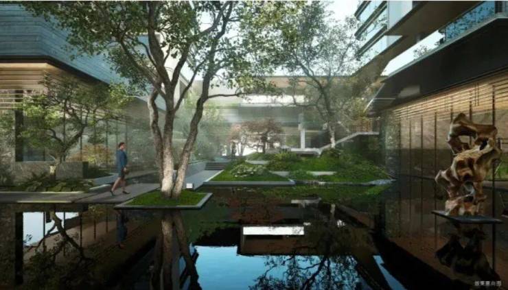 凤起冕旒|东方礼序的当代演绎;主入口门头以古代礼冠“冕旒”为灵感,采用现代设计语汇,构筑约85米“凤起冕旒”华贵门仪。景泰蓝垂幕「旒珠振玉」镶嵌其间,既呼应传统东方礼制,亦致敬苏州的时代封面与源点气质。门庭景观取罗汉松、朴树等珍稀树种,将奢石、水景与自然精巧融合,构筑一方承袭千年盛韵的尊荣之境。