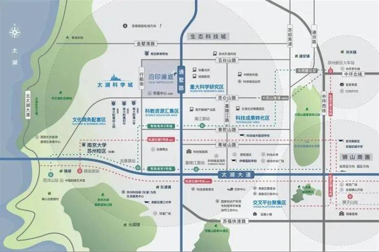 目前太湖科学城已开通有轨电车1号线和2号线,轨交9、11、13、18、21号线将全面覆盖。根据规划,苏锡常城际铁路将途经太湖科学城。项目周边省道、太湖大道,高速畅达主城核心区。大阳山隧道和中环北线西延即将联通,交通再升级。有轨电车2号线漓江路站,轨交9号线、11号线(规划中)近在咫尺,呈现多维交通精彩生活。
