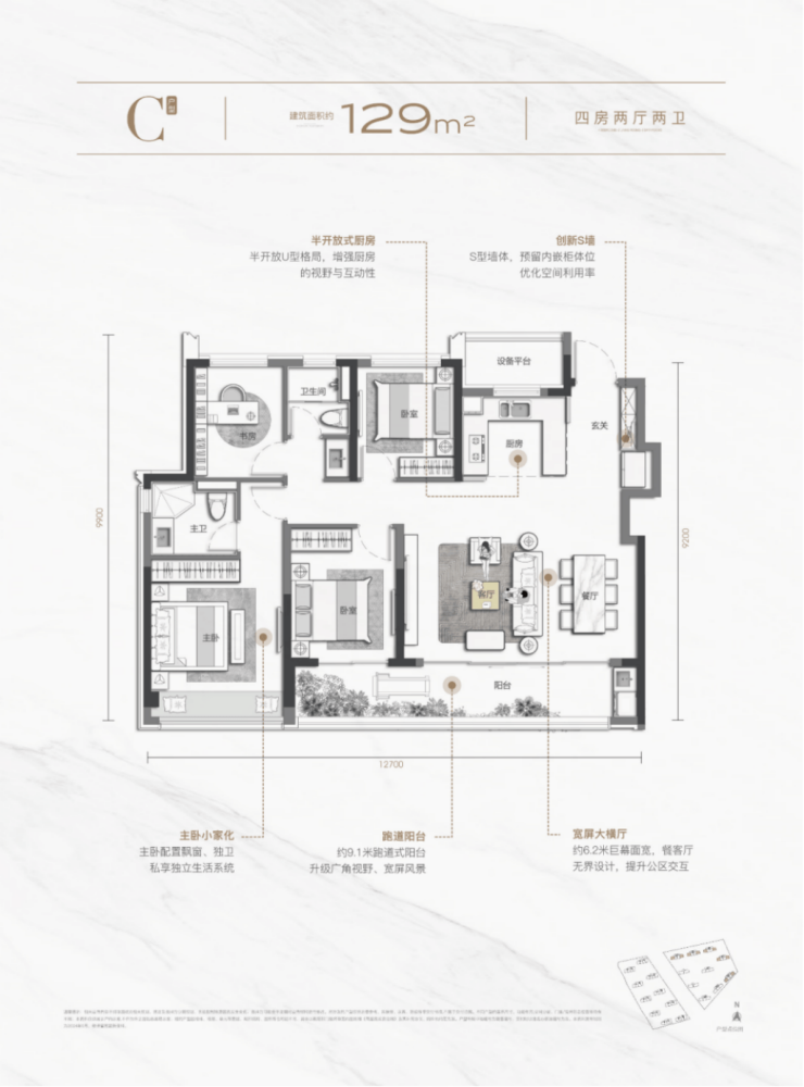 所有户型均采用LDKB一体化设计(客厅、餐厅、厨房、阳台一体化),打通空间边界,半开放式厨房既兼顾了互动性又不失实用性,宽境阳台延伸了生活视野,主卧的套房式设计则为居住者提供了私密和尊崇感