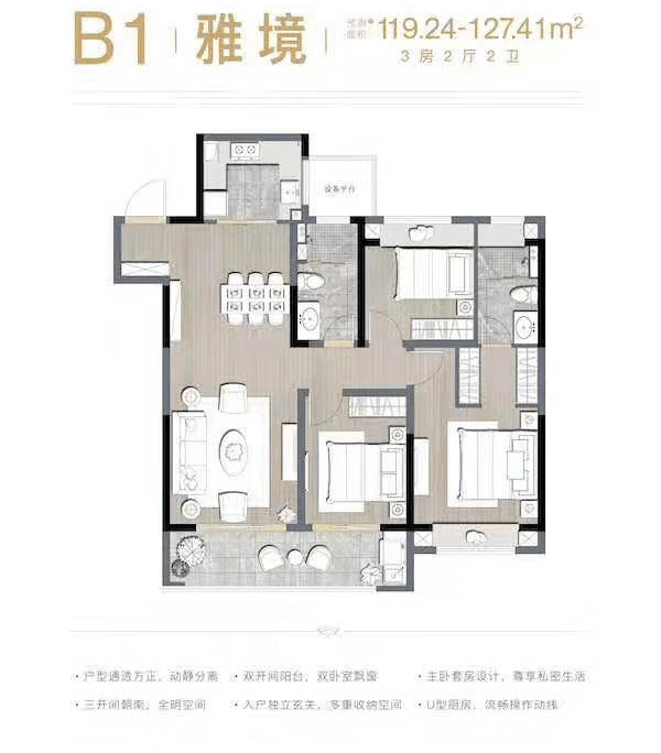 119-122㎡三房/四房:改善首选,拥有约 6.6 米大横厅,双开间阳台,主卧套房设计,兼顾家庭互动与私密性。