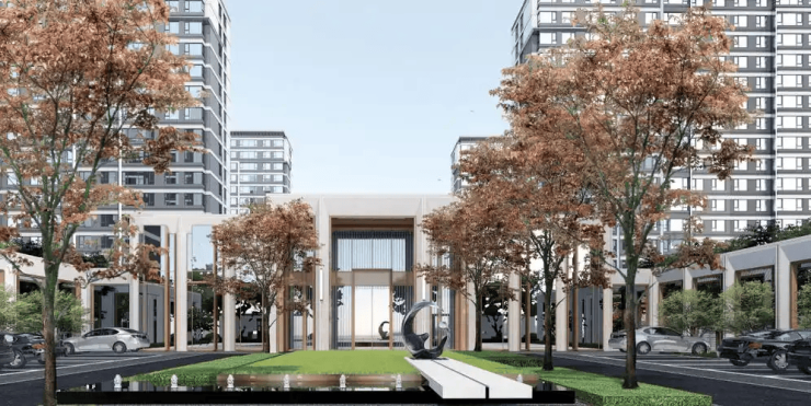 社区内部:采用深灰色质感涂料+象牙白真石漆+铝板外立面,现代感强;社区内规划江南园林与原著会馆(含恒温泳池、私宴厅等)