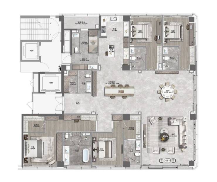 层高4m净高3.4m的朗阔场域中,打造270°巨幕观江视野,超大LDK家庭社交中心,几近绝版的一梯一户,保姆梯直通家政间和厨房,餐客厅面积达到了109m²,远超普通大平层的70m²,4个套房+保姆间的设计,每个人都有自己的独立空间,互不打扰为未来居者盛载流动且美好的生活情境。