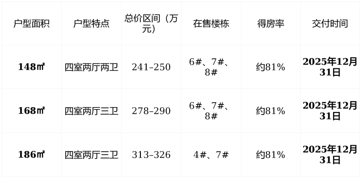 ✅ 温馨提示 :主力户型 148–168㎡ 房源充足, 186㎡大户型 仅剩4#楼少量席位,建议优先锁定南向、高楼层房源。