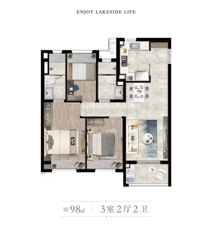 89㎡三房:三开间朝南,1.5卫设计,主卧+客厅一体化,适合三口之家;