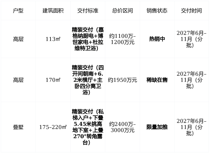 在售状态建面113–170㎡精装高层175–220㎡叠墅均价约10.4万元/㎡总价1100万–2400万元预计2027年6月–11月分批交付得房率76%–81%华润万象生活物业,物业费8.8–11.6元/㎡·月