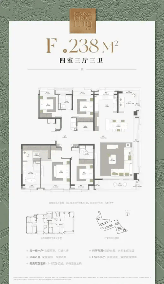 具体来看,康定壹拾玖提供了多种户型选择,主力户型涵盖建面约120-238㎡的三房至四房,满足不同家庭结构的需求。其中,120㎡的三房户型,总价大约在2000万元左右;而更为宽敞的238㎡四房大平层户型,总价则攀升至4000万元以上。这样的价格定位,无疑彰显了康定壹拾玖作为高端住宅项目的尊贵身份,是追求高品质生活的改善型购房者的理想之选。