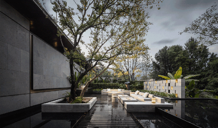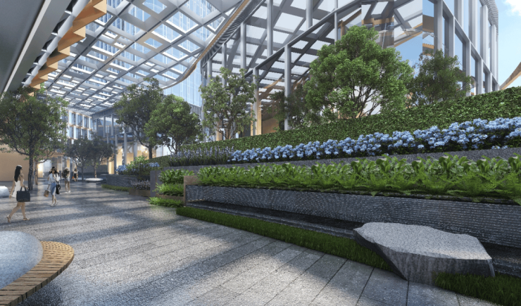 综合体的独特张力通过酒店塔楼立面上标志性的巨型玻璃天幕彰显,并勾勒出内外部庭院的轮廓。环形天幕进一步构成有顶中央走道,既加速空气流通,又在不影响采光的同时遮挡风雨。因此,天幕之下形成了一个全天候的微环境,鼓励住户和游客在室外公共空间举办活动、互动和放松。