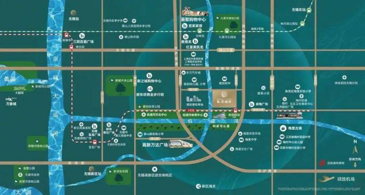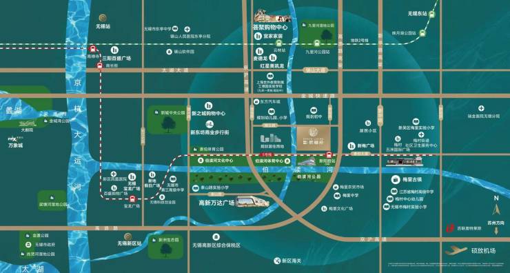 项目距地铁5号线新阳路站3号口(在建)直线距离约100M,距地铁2号线九里河公园站直线距离约 2.8KM,距苏南硕放机场、无锡新区站(高铁站)直线距离约6KM。高铁、地铁、机场等立体交通体系互联互通,构筑起缤纷生活版图。