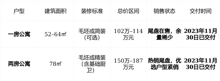 在售状态2023年11月已全面交付,现房销售,尾盘余量有限,主力户型为52–78㎡一至两房,毛坯/精装可选,适合投资客、单身青年、自由职业者