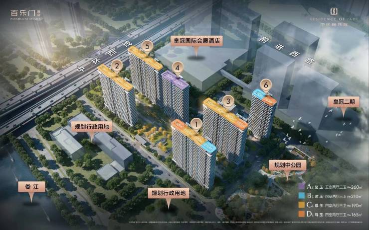 户型面积(㎡)核心特色165㎡165南向三开间,主卧套房设计,独立家政空间190㎡190双套房设计,宽景阳台引景入室210㎡210中西双厨配置,多功能房灵活可变260㎡260奢阔空间尺度,5居室满足大家庭需求