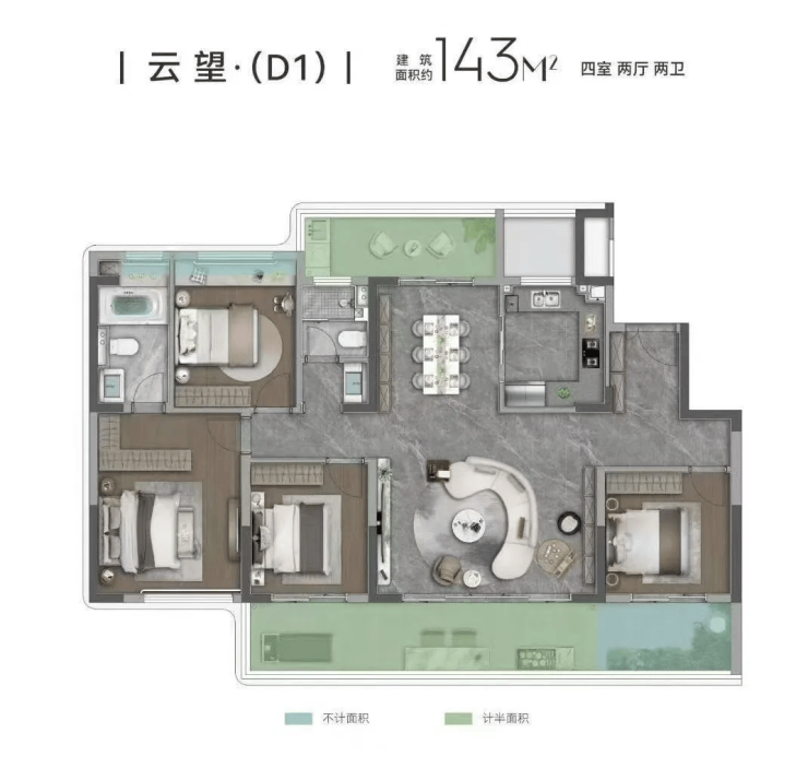 创新采用“客厅+餐厅+厨房+阳台+空中花园”一体化布局,打破传统功能区隔,实现“1个空间,N种生活场景”。例如143㎡户型实得面积达136㎡,相当于多出近15㎡使用空间 。