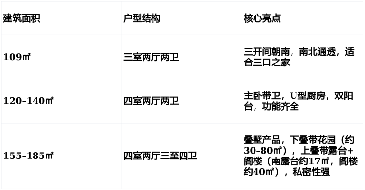 ✅ 户型多样,选择丰富:从109㎡三居到185㎡叠墅,满足不同家庭结构需求