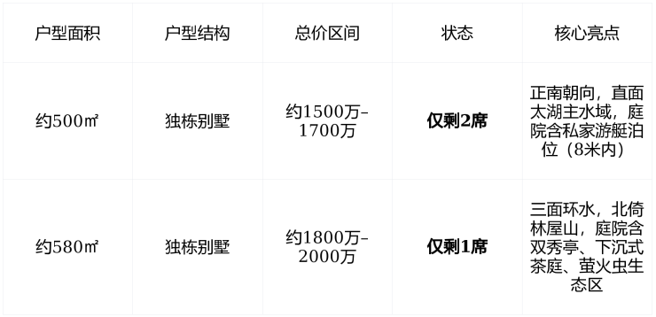 特别提示剩余3席均为“景观优选户” ,含完整太湖视野+游艇泊位+香山帮定制庭院, 无新增,无替补,售完即止