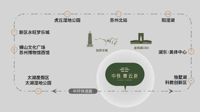 ◎发展之环:中环东接园区产经引擎,西融狮山创新脉络,南承太湖新城生态蓝图,北启高铁枢纽经济,便捷通达苏州多中心,启幕现代化城市发展新篇章。