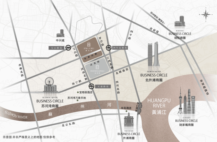 直线距离约3公里范围内,汇聚苏河湾万象天地、北外滩商圈、南京西路商圈、外滩商圈、陆家嘴商圈等