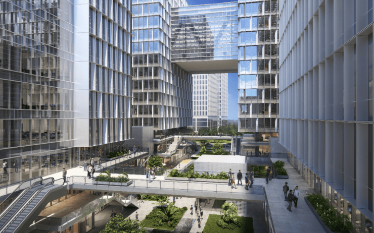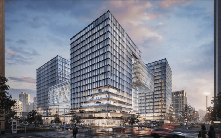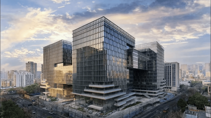 建筑与空间:项目由4栋超甲级办公楼围合组成,标准层高约4.2-4.3米,提供300平方米起灵活分割的办公空间,整层面积约2300-2500平方米,采用无柱设计。大堂为约13.5米挑高、约800平方米的星光艺术大堂,设计灵感源自南宋汝窑瓷韵。