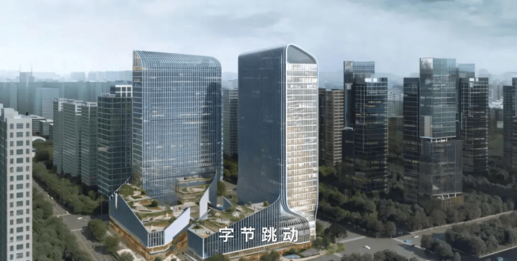 建筑风格为“新中式宋韵”:三重飞檐、坡屋顶、铝板玻璃幕墙