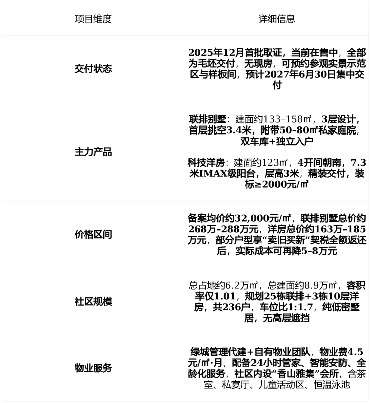 在售状态 : 2025年12月首批取证,当前在售中 , 全部为毛坯交付 , 预计2027年6月集中交付 ,主力产品为 建面133–158㎡联排别墅 与 123㎡科技精装洋房 , 备案均价约32,000元/㎡ , 总价区间163万–288万元 , 剩余房源充足,销售热度持续攀升 。