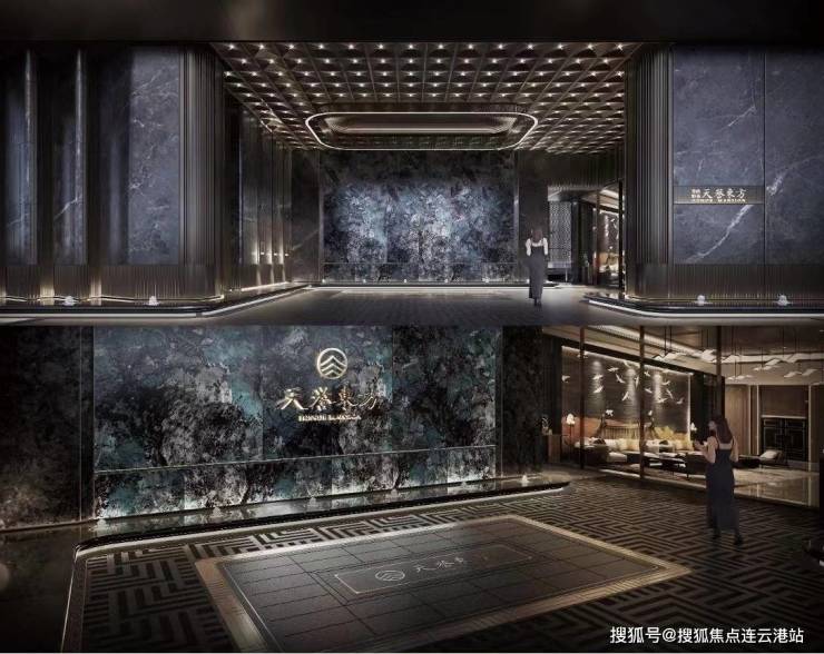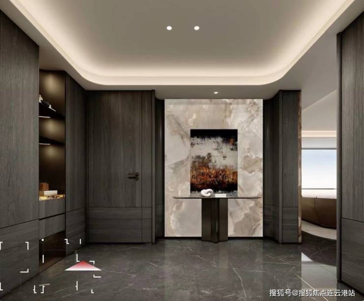 单元门臻选名贵石材搭配香槟金铝板,入户大堂精选翡翠绿岩板,定制3D圆弧吊顶,墙面局部仿木纹铝板铺贴,辅以透光云石导引,电梯轿门金属蚀刻雕纹(仅一层和负一层配置),高定精奢入户大堂。