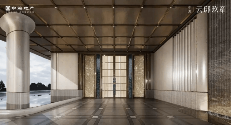 主入口约7米高约40米宽的奢华门头、挑高式的古铜色星空顶,地面选用天然大理石交织,进一步增强归家落客区的奢华感。