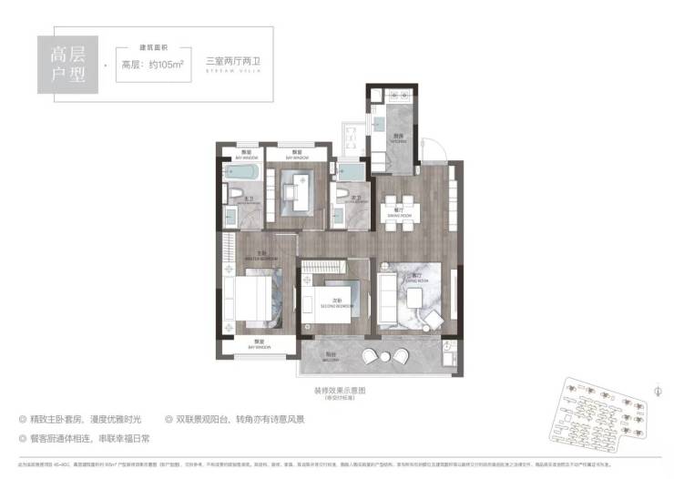 高层:20-26层,面积107-120㎡,精装交付,得房率74%(含赠送85%),同样配备三大件。