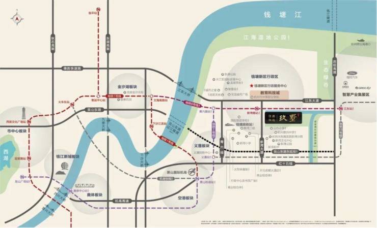 紧邻新湾大道、南堤路,5分钟上钱塘快速路,15分钟达杭州东站,25分钟抵武林广场。