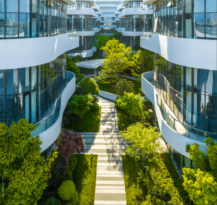 垂直绿化立面+无车流步道,实现“办公在花园,生活在公园”