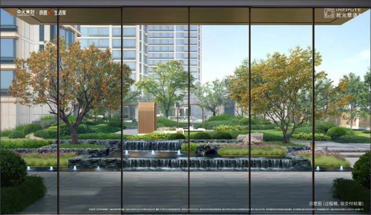 社区打造“一轴四境十二景”园林体系,核心为约400㎡复合景观戏水池,集亲子戏水、静坐观景、邻里社交于一体,非普通绿化可比