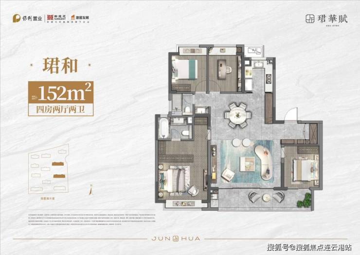建面约 152㎡四居户型,分布于 6 号楼、10 号楼,2 梯 2 户设计,层高 3 米,总楼层 17F。户型格局方正,南北通透,大尺度客厅连接观景阳台,采光通风俱佳;主卧套房设计,配备独立卫浴与衣帽间,私密性与舒适度兼具,满足家庭居住需求。