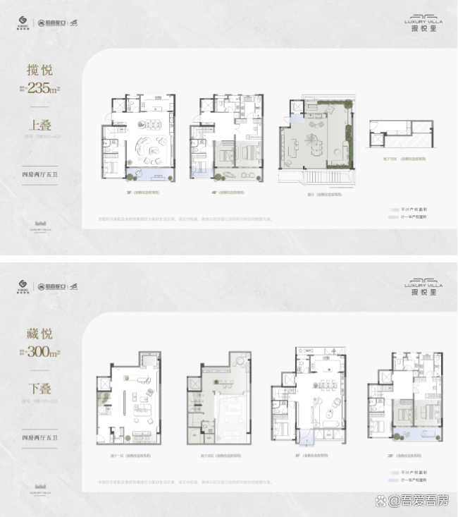 叠墅:建面235-300㎡(拓展后使用面积360-430㎡),四房两厅五卫设计
