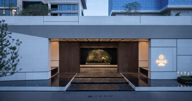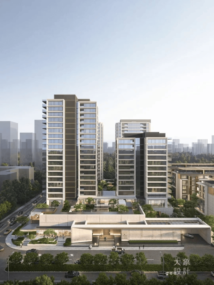 高层外立面由GOA大象设计陆皓操刀,采用横平竖直的立体框感设计,摒弃浮夸曲线,追求静谧美学;叠墅“瑞园”则借鉴蒙德里安画作风格,以石材与金属框格形成错落框景,建筑本身即成风景 。