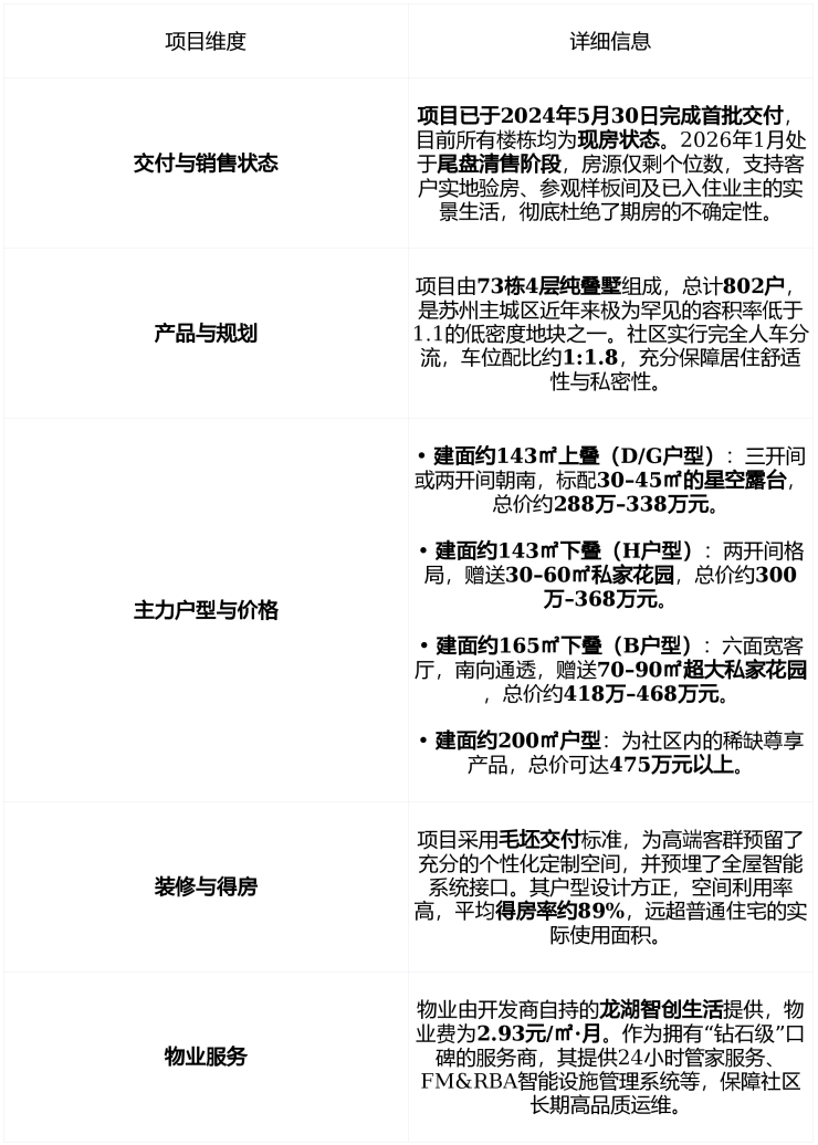 主力产品143㎡–200㎡纯叠墅社区无高层、无洋房备案均价约25,889元/㎡实际成交总价约288万–475万元/套得房率高达89%全为毛坯交付