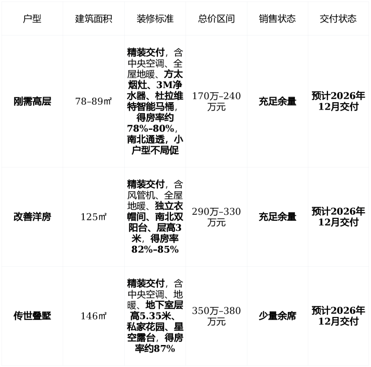 项目真相 : 不是普通期房,而是国企华纺打造的“1.8低密复合社区” , 78–146㎡高层+洋房+叠墅全系精装,2026年交付,无现房,但户型精准、总价亲民、配套成熟 。