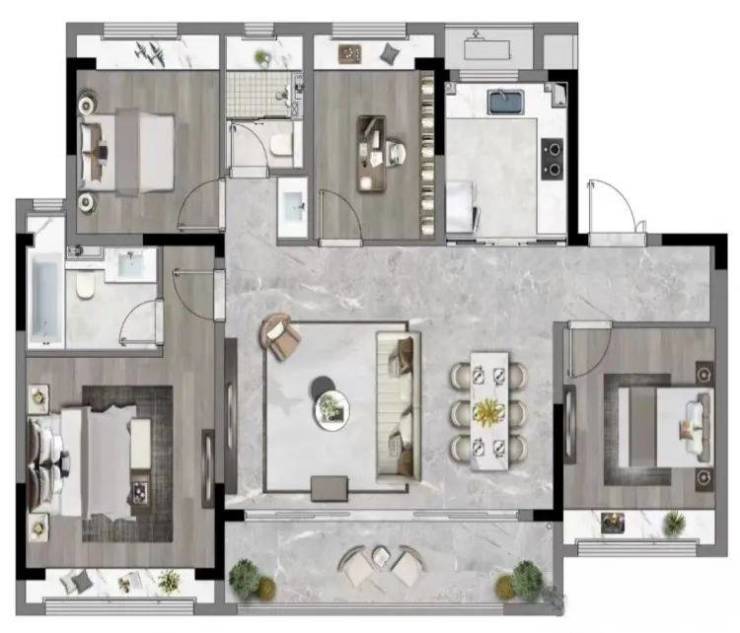 119㎡四室两厅两卫:南向三开间,面宽约11m,双联阳台面宽约7.3m,主卧套房设计