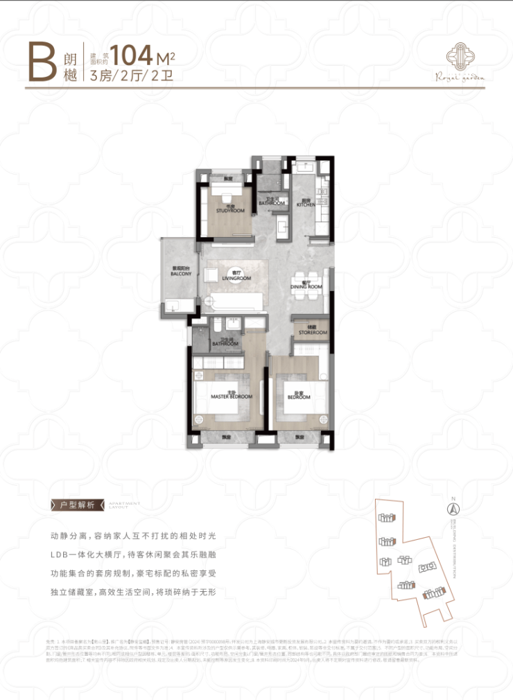 建面约104㎡的三房户型同样出彩,均为楼栋边套,是观景户型——客厅连接270°阳台,视野出众;双卧朝南,阳光满溢;还配有独立储藏间,非常难得。
