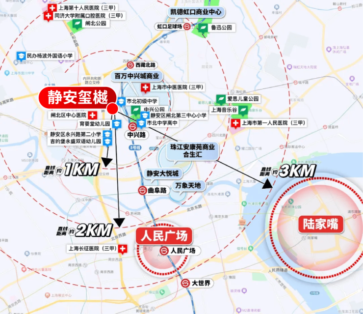商业方面,项目1公里范围内有静安大悦城、万象天地、凯德虹口商业中心、百万中兴城商业(在建中)等大型商场。